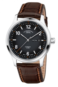 Reference M1-43-26-LB has a black dial with orange accents and is fitted a brown crocodile leather strap.